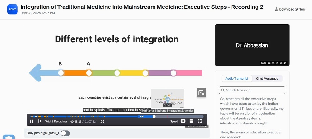 به گزارش روابط عمومی دانشکده طب ایرانی دانشگاه علوم پزشکی تهران؛ در این نشست دکتر میثم شیرزاد، معاون بین الملل دانشکده طب ایرانی دانشگاه علوم پزشکی تهران به رویکرد جدید سازمان بهداشت جهانی در تلفیق طب سنتی و مکمل در نظام رایج سلامت در استراتژی 2034-2025  اشاره و بر اهمیت ادغام خدمات طب سنتی ایرانی در نظام سلامت کشور تأکید کرد.