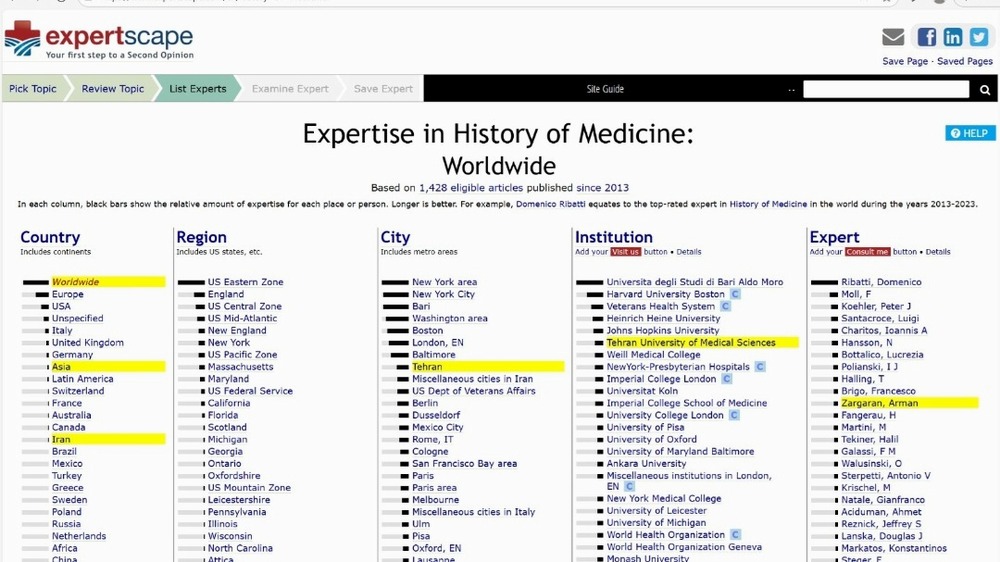 پایگاه expertscape این تحلیل را با بررسی مقالات چاپ شده در مجلات نمایه شده در پایگاه استنادی Medline بین سال های ۲۰۱۳ تا ۲۰۲۳ اعلام کرده است. این تحلیل براساس کلیدواژه های سرفصل های موضوعی پزشکی (MeSH) در درختواره دانش پزشکی است و مقالات براساس تعداد، نوع، کیفیت مجله چاپ شده، جایگاه نویسنده در لیست نویسندگان و موارد مرتبط دیگر بررسی می شود.