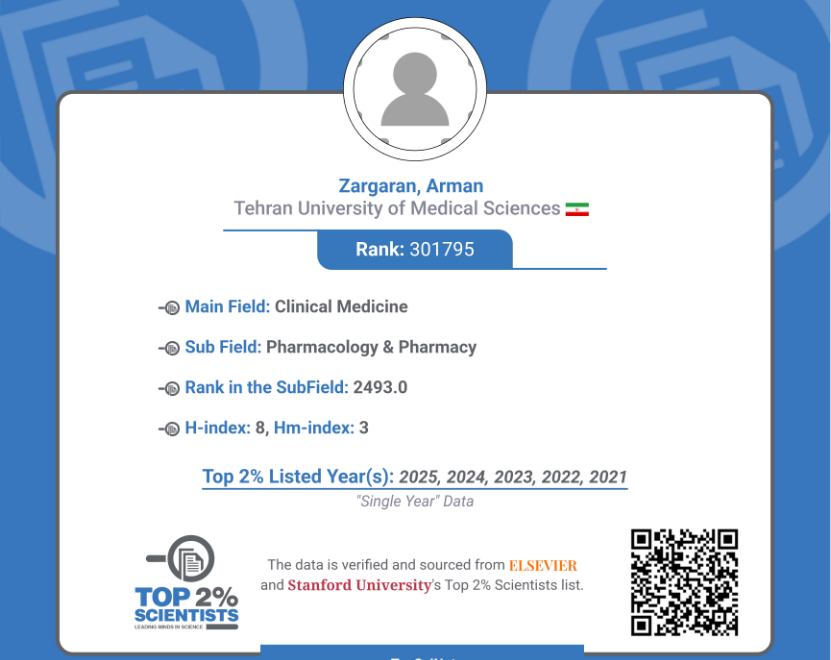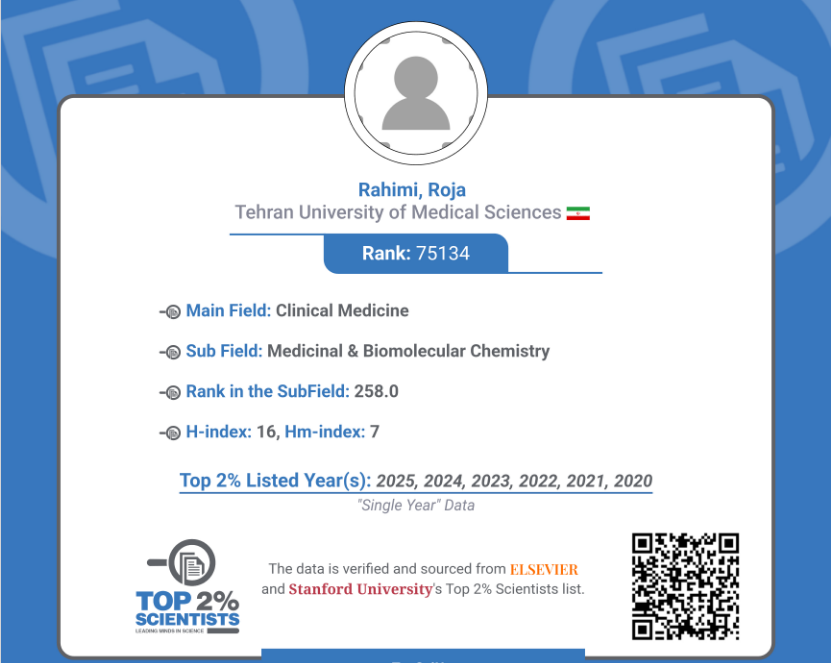 «با کمال افتخار و مسرّت، کسب موفقیت ارزشمند سه تن از اعضای فرهیخته و پرتلاش هیأت علمی دانشکده طب سنتی دانشگاه علوم پزشکی تهران، سرکار خانم پروفسور روجا رحیمی، سرکار خانم دکتر رودابه بهرام سلطانی، و جناب آقای دکتر آرمان زرگران را در قرار گرفتن در فهرست دو درصد دانشمندان برتر جهان صمیمانه تبریک و تهنیت عرض مینمایم.
